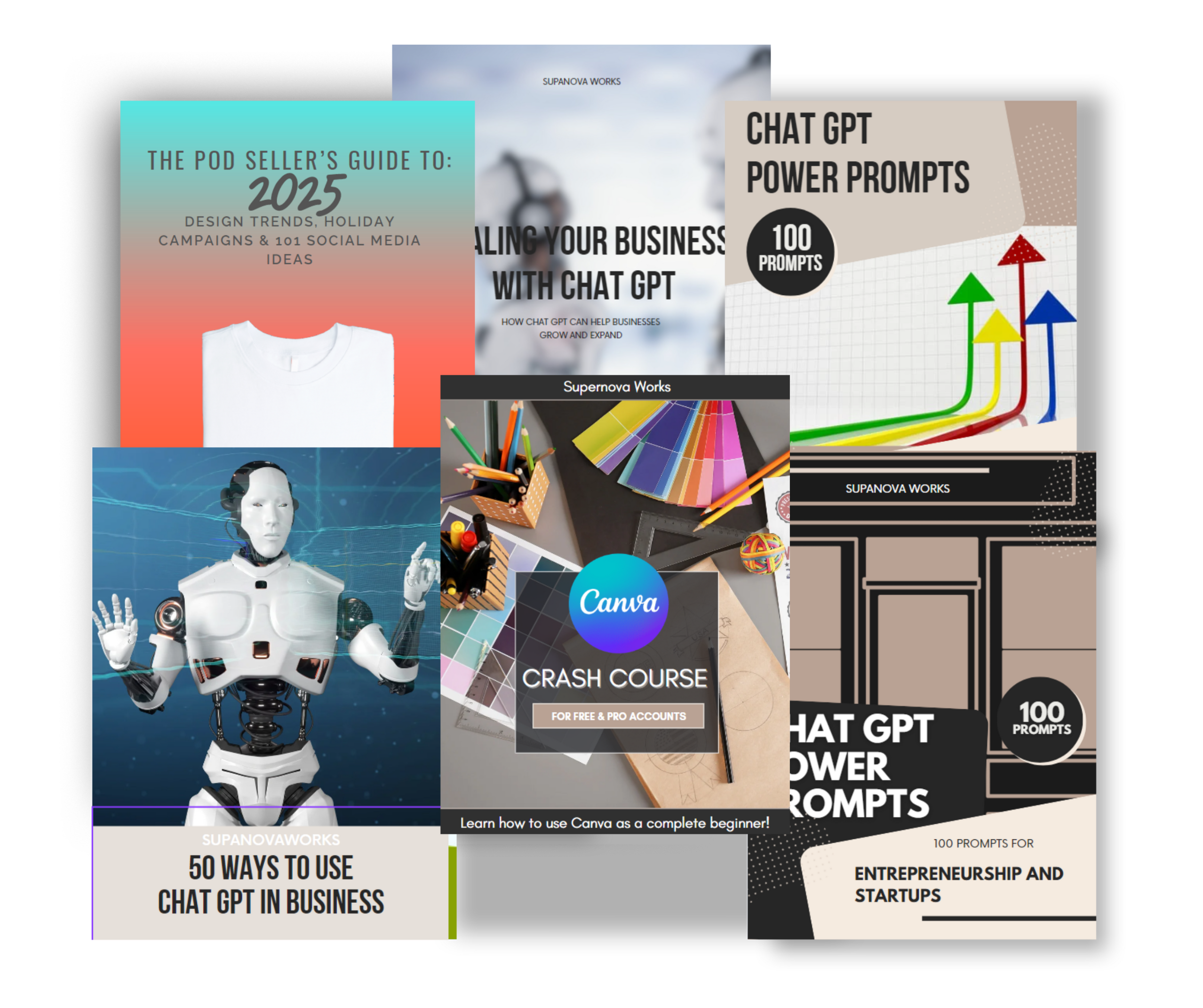 E-book Bundle: "The POD Seller’s Guide to 2025," "Scaling Your Business with Chat GPT," and "50 Ways to Use Chat GPT in Business."